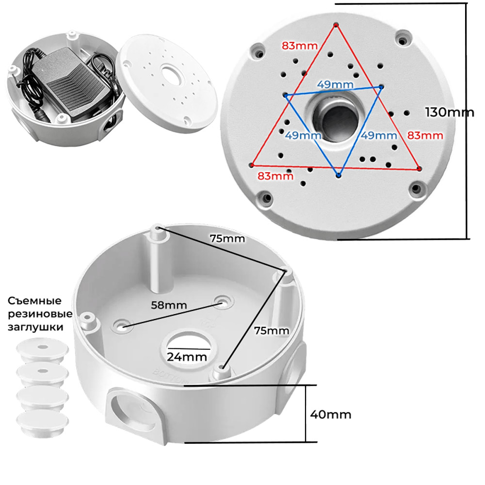Коробка оснащена четырьмя кабельными вводами с гермо- вставками для удобного размещения провода - два по бокам, у основания и на крышке. Площадка для установки камеры представляет собой круг диаметром 130мм с большим числом несквозных углублений для метизов. Данный параметр гарантирует высокую вероятность совместимости кронштейна и камер. Кронштейн из прочного ABS отличается полным отсутствием коррозии и позволяет надолго сохранить эстетичный вид конструкции и защищает изделие от прямых попаданий осадков.