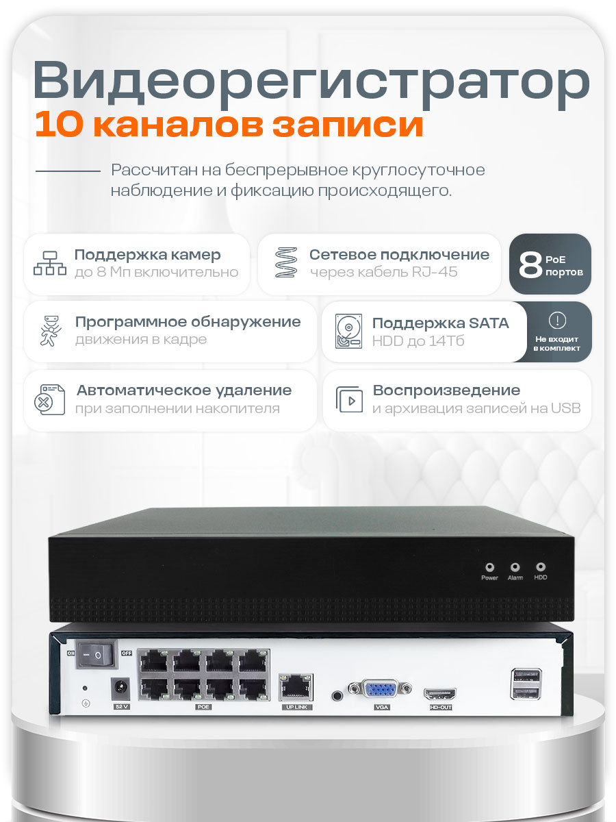 Многоканальный цифровой видеорегистратор оснащен входом RJ-45 для подключения к сети и 8 разъемами для подключения камер с поддержкой PoE. Чтобы увидеть изображение с камер на мониторе задняя сторона регистратора снабжена VGA и HDMI выходами для его подключения. При этом для разрешение картинки может изменяться в меню настроек. Организация записи звука на цифровых системах организуется исключительно средствами IP камер. Единственный аудиовыход на корпусе регистратора при необходимости подключается к внешнему динамику. Можете использовать 2 USB разъема для подключения внешних устройств. Один, как правило, задействован манипулятором "мышь". Питание видеорегистратора осуществляется от постоянного тока DC 52 Вольта. Таким образом, имеется возможность получить стабильную систему видеонаблюдения 24\7 круглый год.